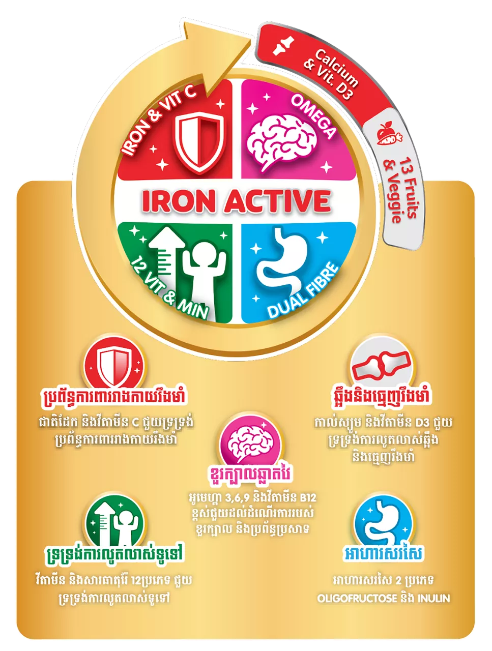 ជាមួយរូបមន្ត IRON ACTIVE ផ្តល់នូវអាហារូបត្ថម្ភ សំខាន់ៗជាច្រើនដូចជា៖ Omega 3, 6, 9 & Vitamin B12 ជាតិដែក អាហារសរសៃ វីតាមីន សារធាតុរ៉ែ បន្លែ និងផ្លែឈើ ដើម្បីកូនកាន់តែរឹងមាំ និងការអភិវឌ្ឍកាន់តែពេញលេញ។