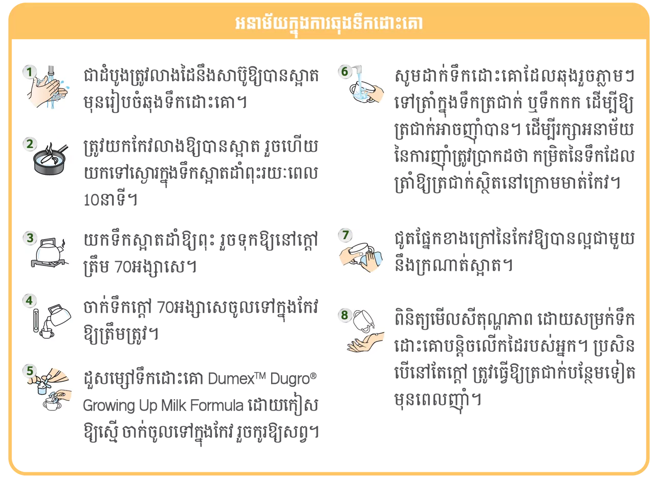 ដួសម្សៅទឹកដោះគោ Dugro លេខ3 ចំនួន 3ស្លាបព្រាវាស់ (36 ក្រាម) លាយជាមួយទឹកដាំពុះទុកឲ្យក្តៅ (70 អង្សាសេ) ចំណុះ 195មីលីលីត្រ ។ កូរឲ្យសព្វមុនពេលទទួលទាន។ ទឹកដោះគោឆុងម្តងញុំាបានម្តងគត់។ ទឹកដោះគោឆុងហើយមិនញុំាត្រូវចាក់ចោល។