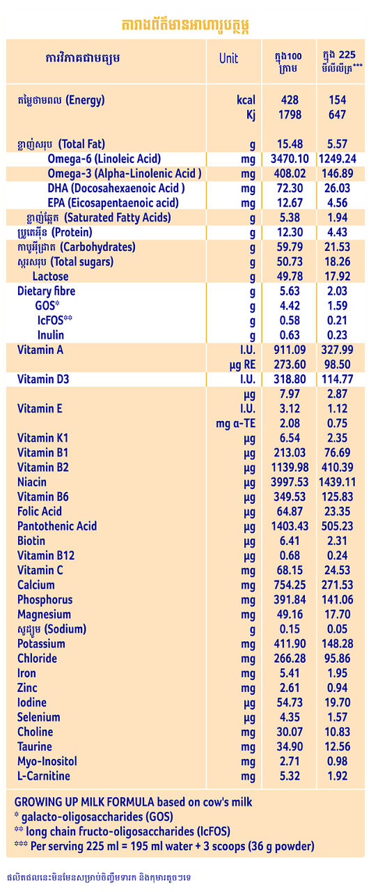 ជាមួយគុណប្រយោជន៍ខ្ពស់ជាងគេ3ដង* សម្រាប់ខួរក្បាលល្អ ក្រពះពោះវៀនល្អ និងការលូតលាស់។