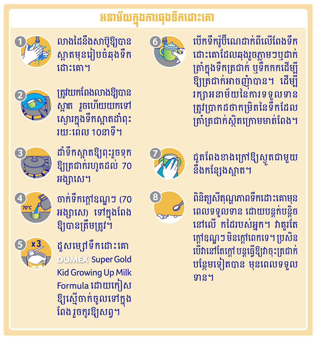 ការចិញ្ចឹមកូនដោយបំបៅដោះ គឺជាទម្រង់ដ៏ល្អបំផុតសម្រាប់ទារក ហើយផ្តល់អត្ថប្រយោជន៍ ជាច្រើនទៅដល់ទារក និងមាតា។ នៅក្នុងពេលត្រៀមបំបៅដោះ និងអំឡុងពេលបំបៅដោះ វាគឺជាការសំខាន់ដែល គួរតែទទួលទាន នូវរបបអាហារដែលមានតុល្យភាព និងសុខភាពល្អ។ ការបំបៅដោះ និងប្រើទឹកដោះគោផងរួមគ្នា នៅសប្តាហ៍ ដំបូងនៃជីវិត អាចកាត់បន្ថយការផ្គត់ផ្គង់នៃទឹកដោះ ហើយនឹងធ្វើឲ្យការបំបៅទឹកដោះមានភាព លំបាក។ ជានិច្ចកាល ត្រូវពិគ្រោះយោបល់ជាមួយអ្នកជំនាញថែទាំសុខភាពដើម្បីសុំដំបូន្មានអំពីការចិញ្ចឹមកូនរបស់អ្នក។ បើសិនអ្នកប្រើទឹកដោះគោម្សៅផ្សំតាមរូបមន្ត អ្នកគួរធ្វើតាមការណែនាំរបស់រោងចក្រផលិត ដើម្បីប្រើប្រាស់ឲ្យបានប្រុងប្រយ័ត្ន។
